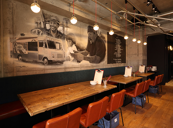 一歩足を踏み入れるとコンクリート打ちっぱなしのスタイリッシュな空間が広がっています。コンクリートの壁にはアーティストの手によって描かれた壁絵があり、記念写真撮影の背景にぴったり。