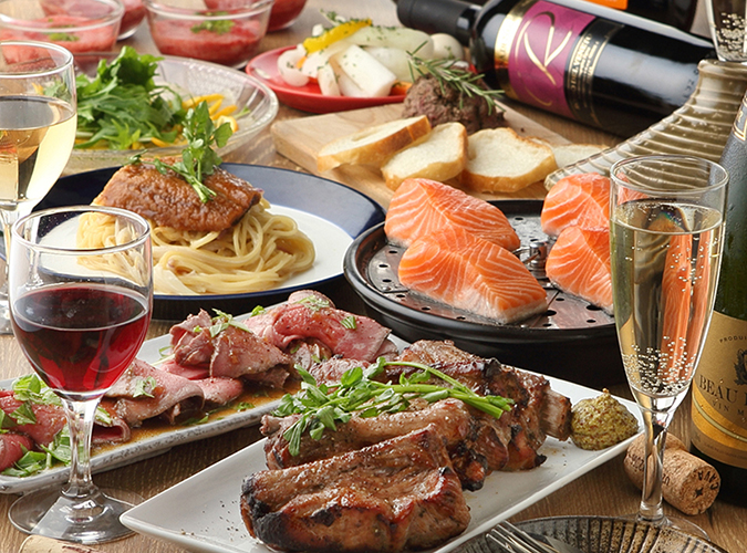 お肉と魚介類をふんだんに使用した豪華料理でパーティーを楽しんでいただきます。骨付き鶏モモ肉のローストや鮮魚とアボカドのカルパッチョなど、ボリューム満点の内容でお届け!